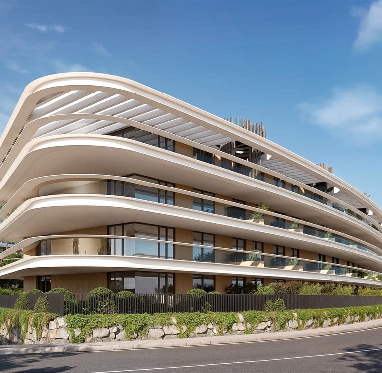 In addition, the residential complex offers spacious landscaped recreational areas, including a spectacular overflow pool that flows from the first floor to the ground floor, creating a dramatic double-height waterfall effect. Amenities also include a gym, changing rooms, coworking space, storage rooms, and parking spaces with pre-installation for electric vehicles.