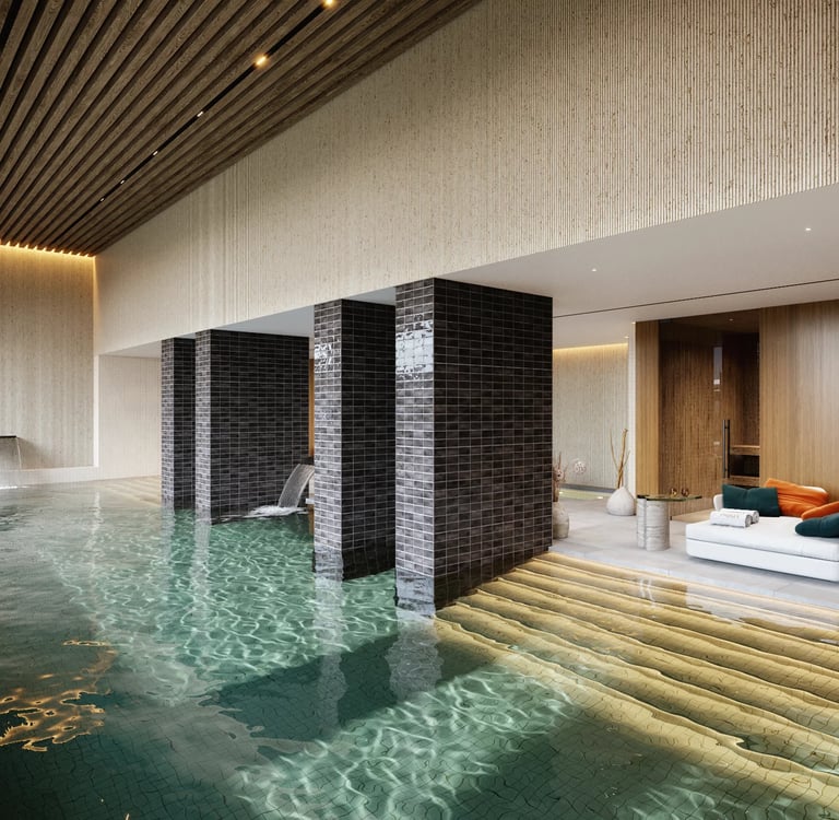 Residents enjoy a Social Club with access to a complete wellness area , which includes a fully equipped gym with an outdoor terrace for practicing yoga outdoors , a serene spa area with a jacuzzi, wet sauna and dry sauna , and a heated indoor pool over 30 meters long.